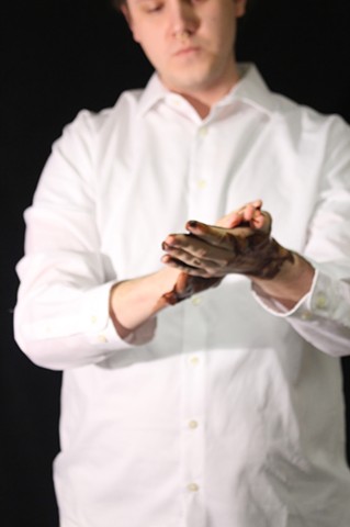 Durational performance on Valentines Day 2018 in which I hugged myself for half an hour with Hershey's chocolate syrup covering hands while dressed for a date. As I caressed my own form, the act became a meditation on expectations of partnership and performative romance. The dress shirt was then installed as a material witness of the performance alongside photo documentation.
